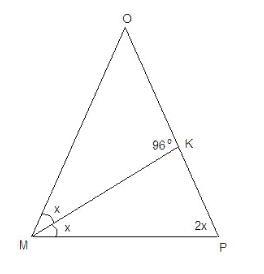 Найди углы при основании MP равнобедренного треугольника MOP, если MK - его биссектриса и угол OKM = 96 градусам. Пожалуйста!!