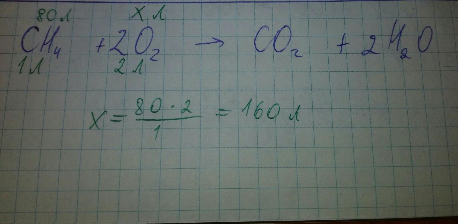 при горении 80 л метана образовались углекислый газ и вода. определите объём кислорода, вступившего в реакцию с метаном