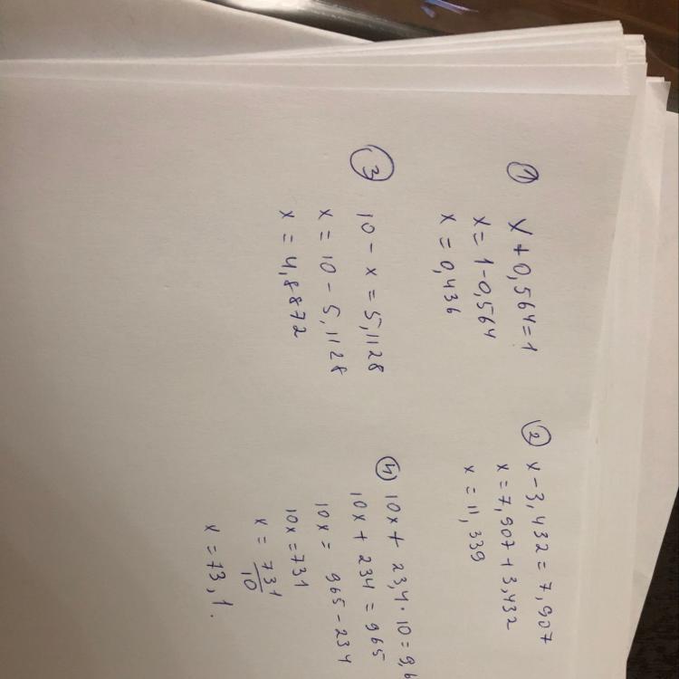 x+0,564=1 x-3,432=7,907 10-x=5,1128 10x+23,4*10=9,65*100
