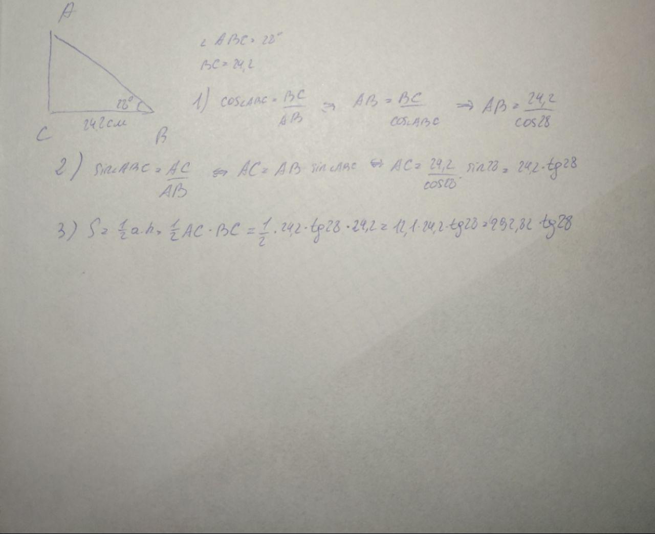 В прямоугольном треугольнике острый угол равен 28 градусов, а принадлежащий к этому углу катет 24,2 см. Вычислите другой катет, гипотенузу и площадь