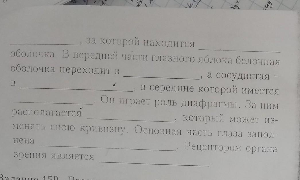 За которой находится сосудистая оболочка. В передней части глазного яблока белочная оболочка переходит в прозрачную раговицу, а сосудистая в среднюю, в середине которой имеется радужка. Он играет роль диофырагмы. За ним розпологается хрусталик, который может изменять свою кривизну. Основная часть глаза заполнена стекловидным телом. Рецептором органа зрения является палочки и колбочки.