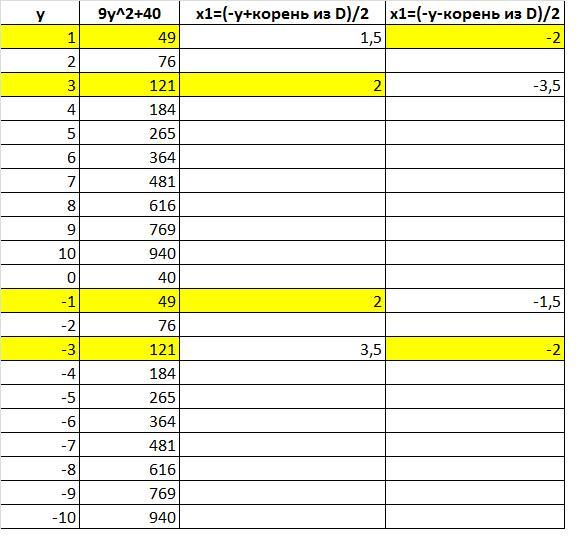 придавая у значения равные целым числам будем вычислять дискриминант, и если он целый то вычислим корни если они целые то все хорошо