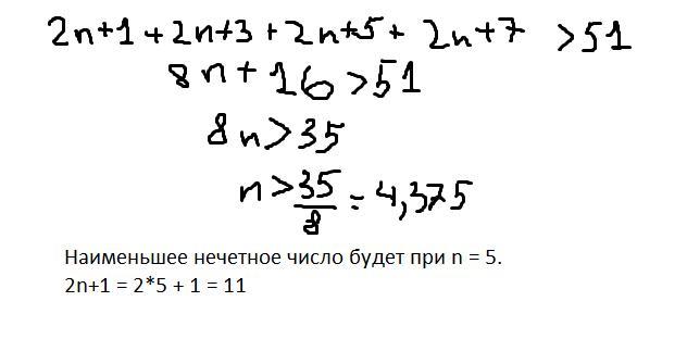 Сумма нечетного числа с тремя последующими нечётными числами больше, чем 51. Найдите наименьшее нечетное число, удовлетворяющее этому условию .