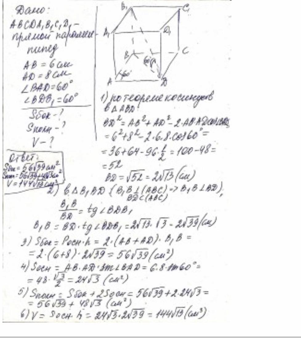 2. В прямоугольном параллелепипеде стороны основания равны 6 см и 8 см,а диагональ параллелепипеда наклонена к плоскости основания под углом 60 градусов.Найдите объем параллелепипеда.