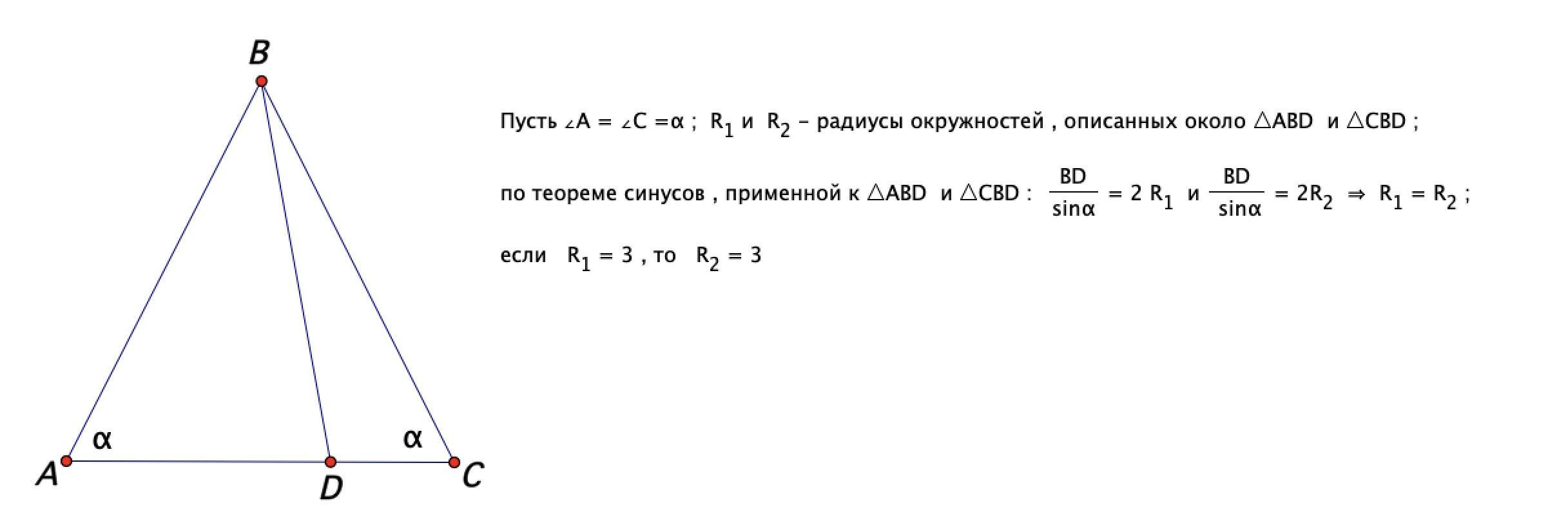 Точка D лежит на основании АС равнобедренного треугольника АВС, причем AD/BC=3/5. Известно, что радиус описанной окружности треугольника ABD равен 3.