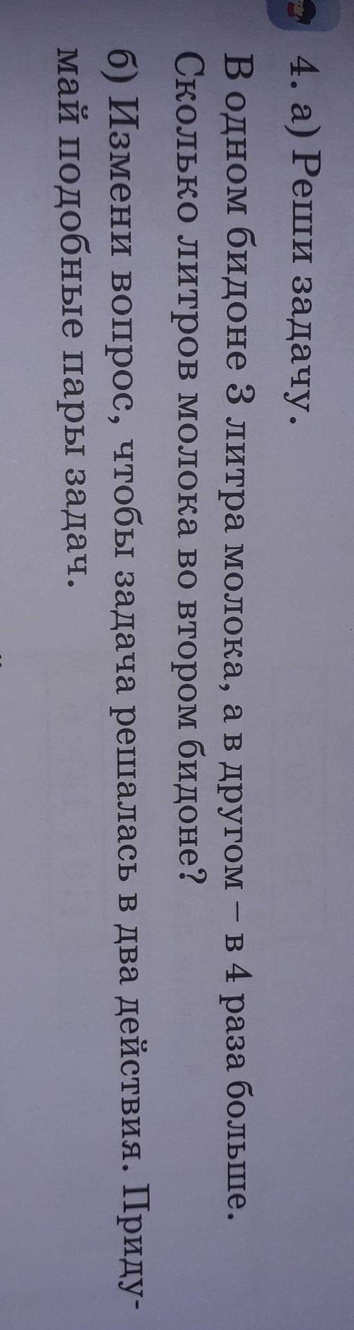 В одном бидоне 3 л. Молока,а в другом в 4 раза больше. Сколько всего литров молока в двух бидонах?