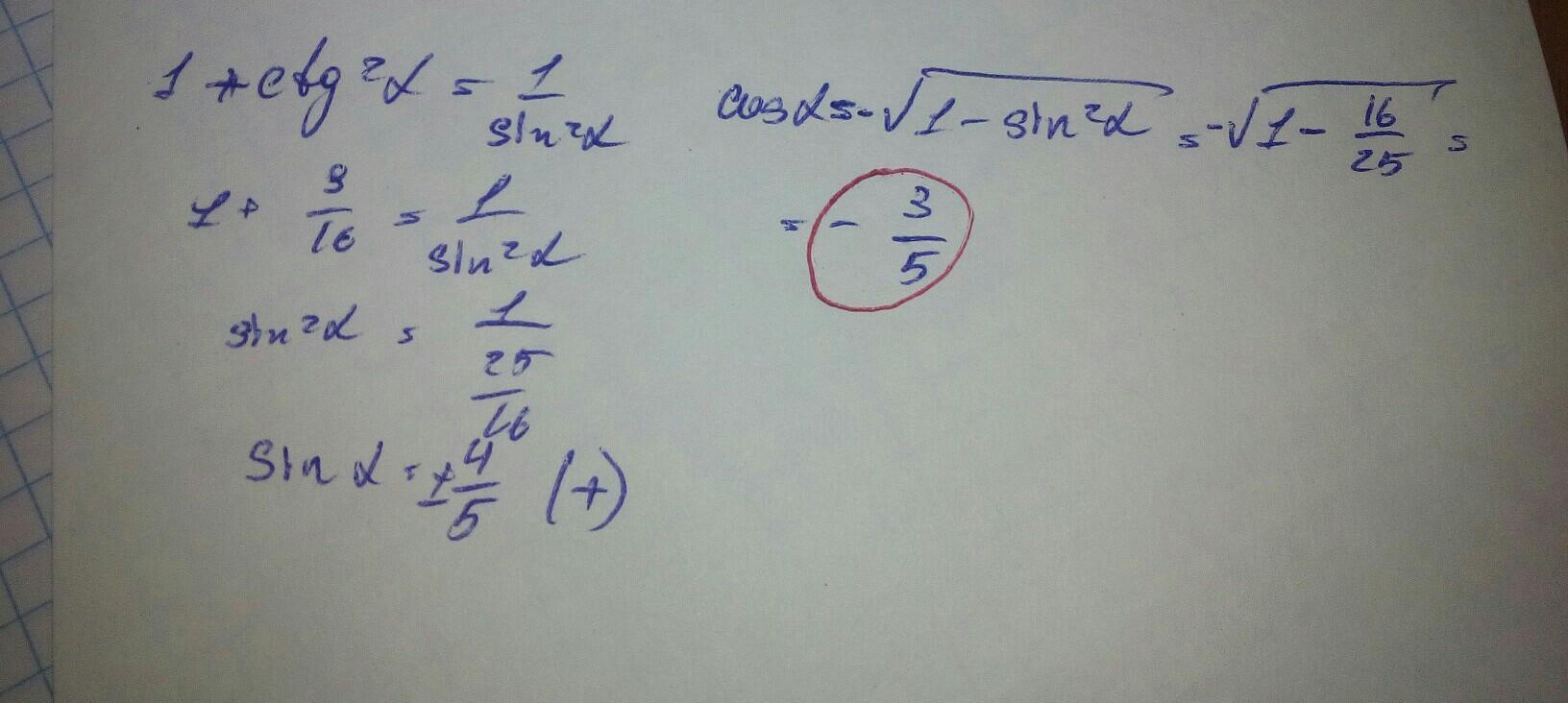 Если ctg a= -0,75 и а принадлежит 2 четверти, то cos а равен
