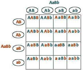 3 закон про дигибридное скрещивание, независимое наследие. Он взял уже не только цвет растения, а добавил еще к нему размер листьев, к примеру. Вот что получается (AaBb x AaBb = 9:3:3:1, смотри картинку ниже).