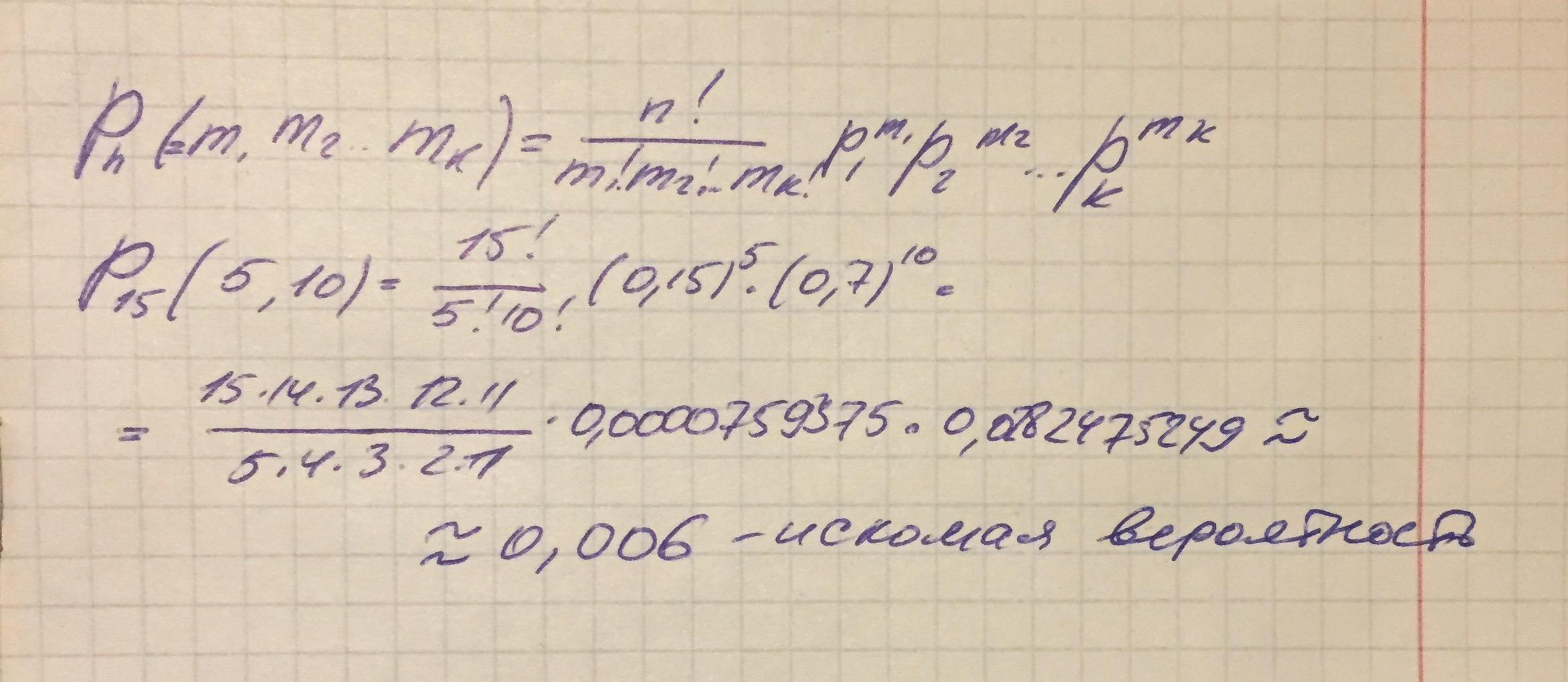 Теория вероятности. На каждый лотерейный билет с вероятностью 0,15 может выпасть крупный выигрыш, с вероятно-стью 0,15 - мелкий выигрыш и с вероятностью 0,7 билет может оказаться без выигрыша. Куплено 15 билетов. Определить вероятность получения ровно 0 крупных выигрышей и 5 мелких.