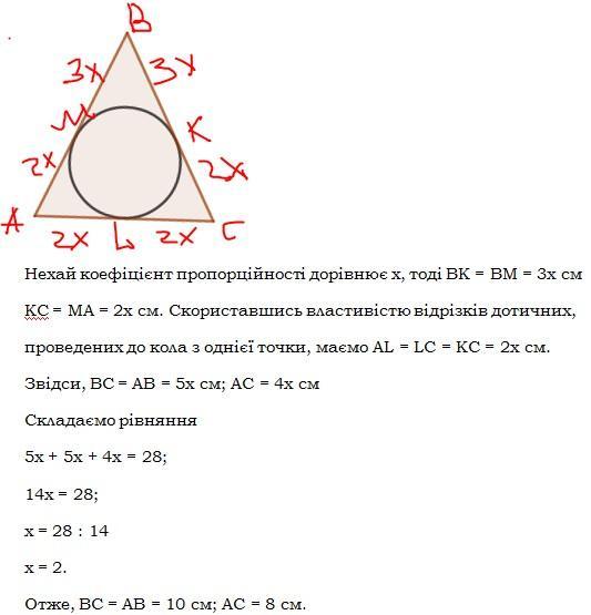 Периметр рівнобедреного трикутника дорівнює 28см, а бічна сторона ділиться точкою дотику вписаного кола у відношені 3 : 2, починаючи від вершини трикутника.