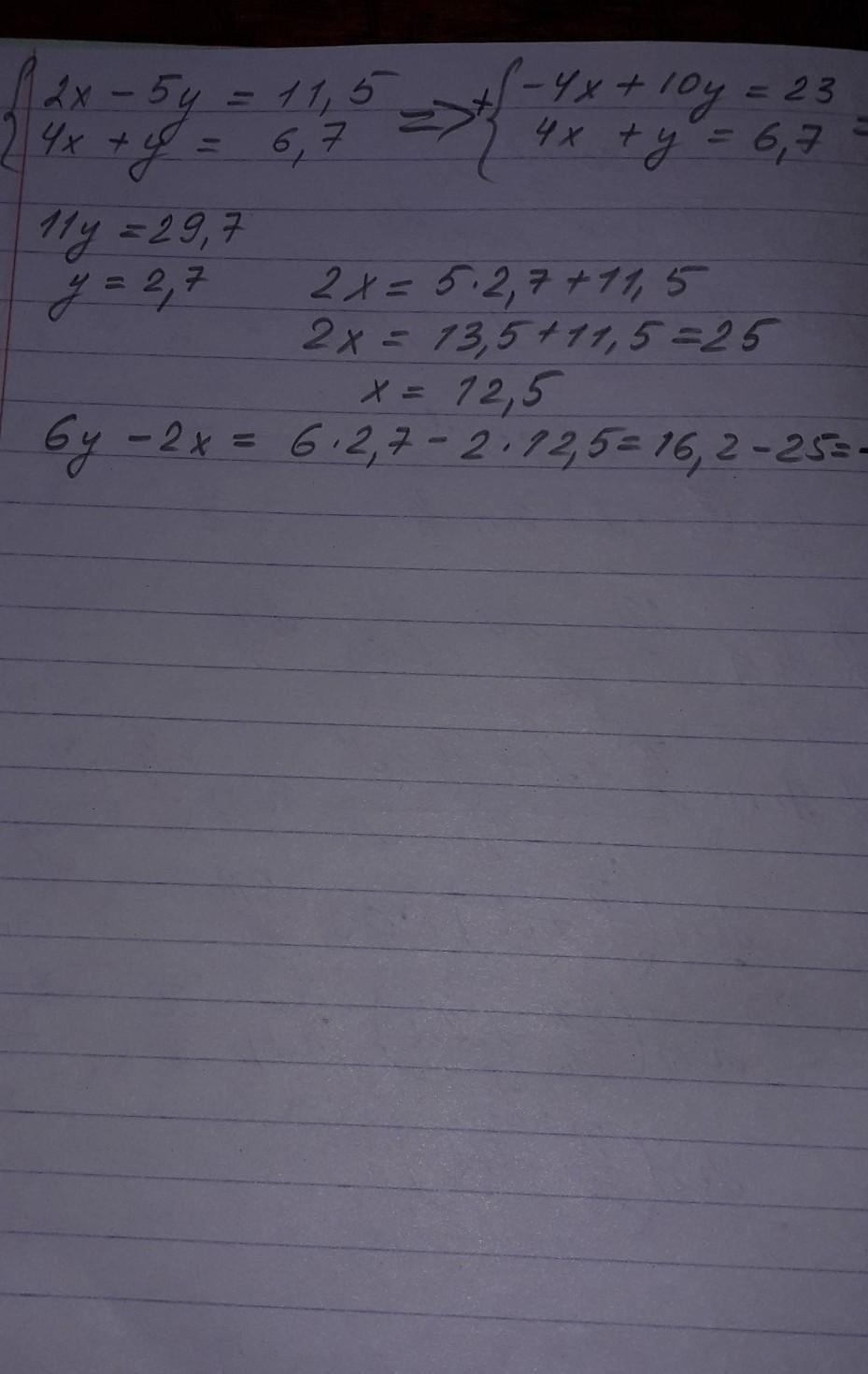 найдите 6у-2х, если 2х-5у=-11,5, а 4х+у=6,7