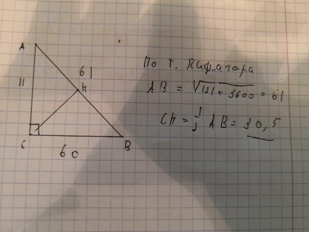 Найдите медиану, опущенную к гипотенузе прямоугольного треугольника, если его катеты 11см и 60см