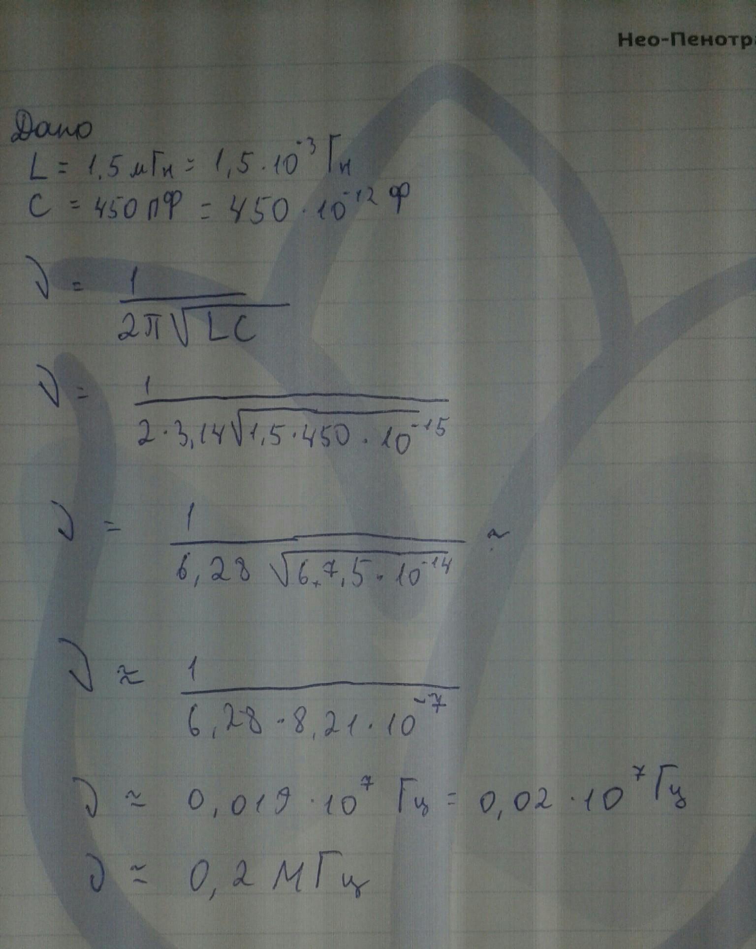 определить частоту колебаний в контуре с катушкой индуктивностью 1.5 мГн и конденсатором ёмкостью 450 пФ ПОМОГИТЕ ПОЖАЛУЙСТА СРОЧНО!!!!!