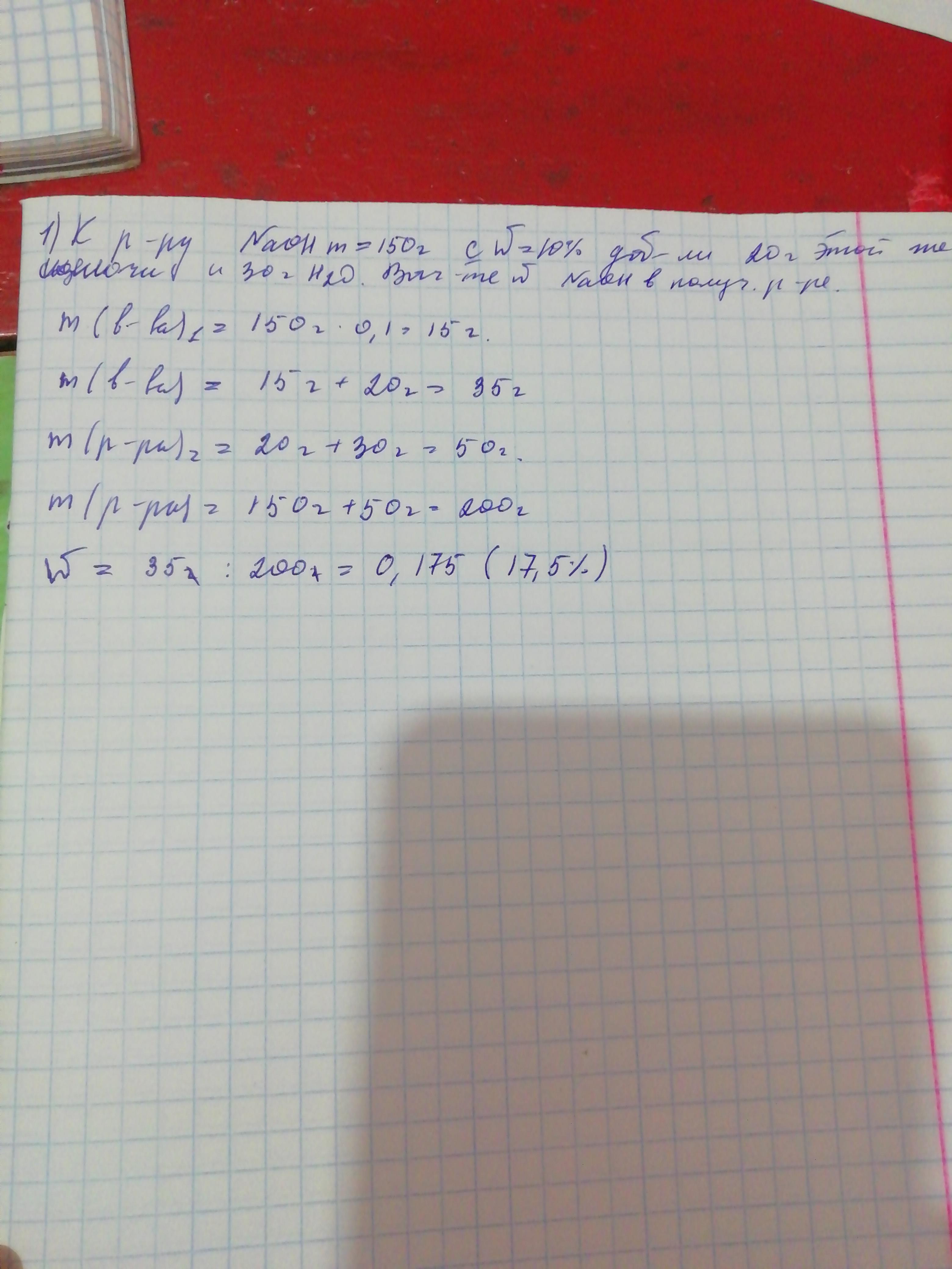 К раствору гидроксида натрия массой 150г с массовой долей 10% добавили 20г этой же щелочи и 30г воды. Вычислите массовую долю гидроксида натрия в полученном растворе.