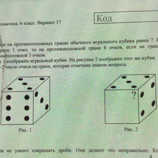 На рис. 1 изображён игральный кубик . На рисунке 2 изображен этот же кубик . Напишите на рисунке 2 число очков на грани, которая отмечена знаком вопроса
