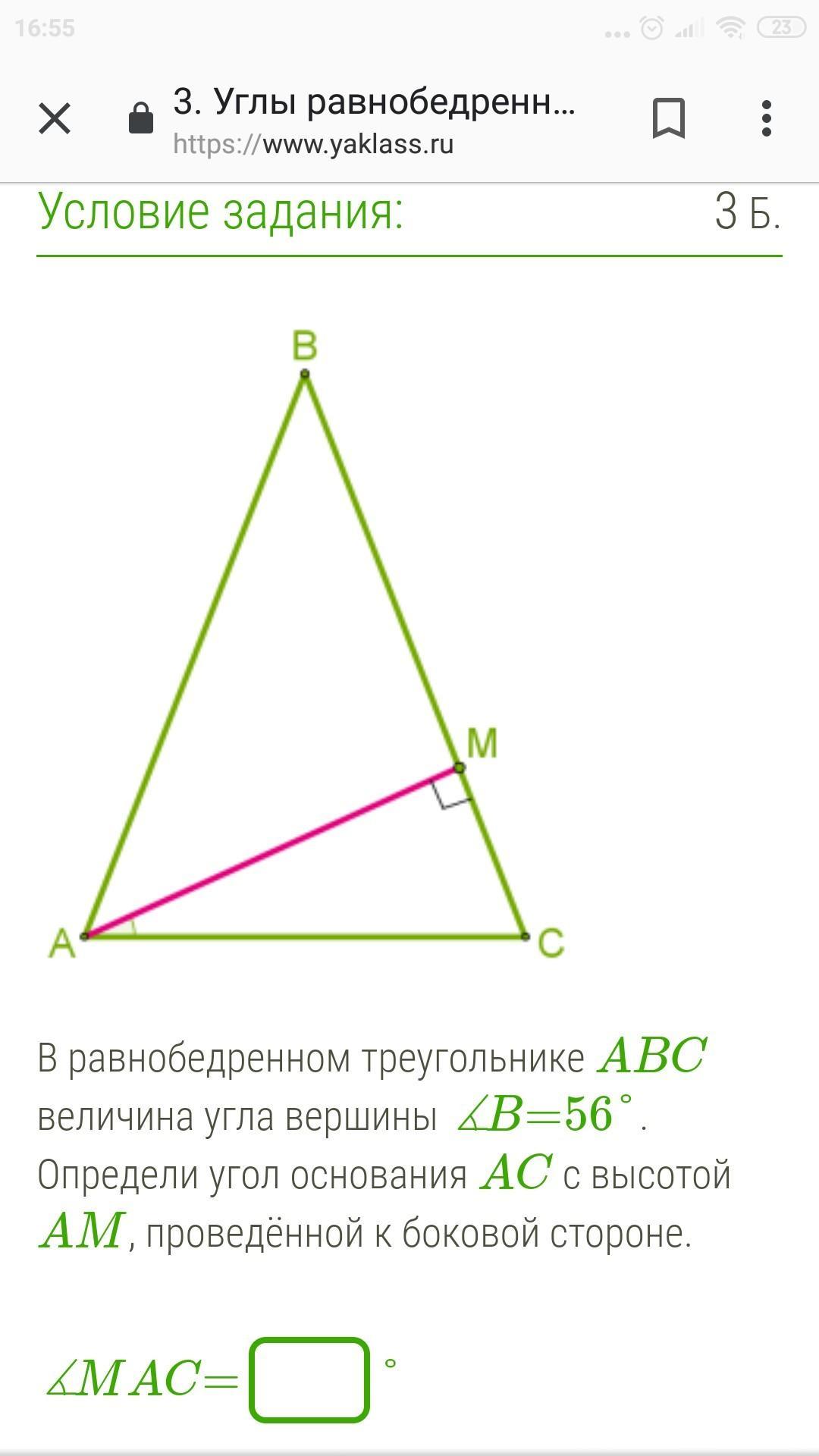 1) Найдем углы при основании(они равны): 180°-56°/2=124°/2=62°