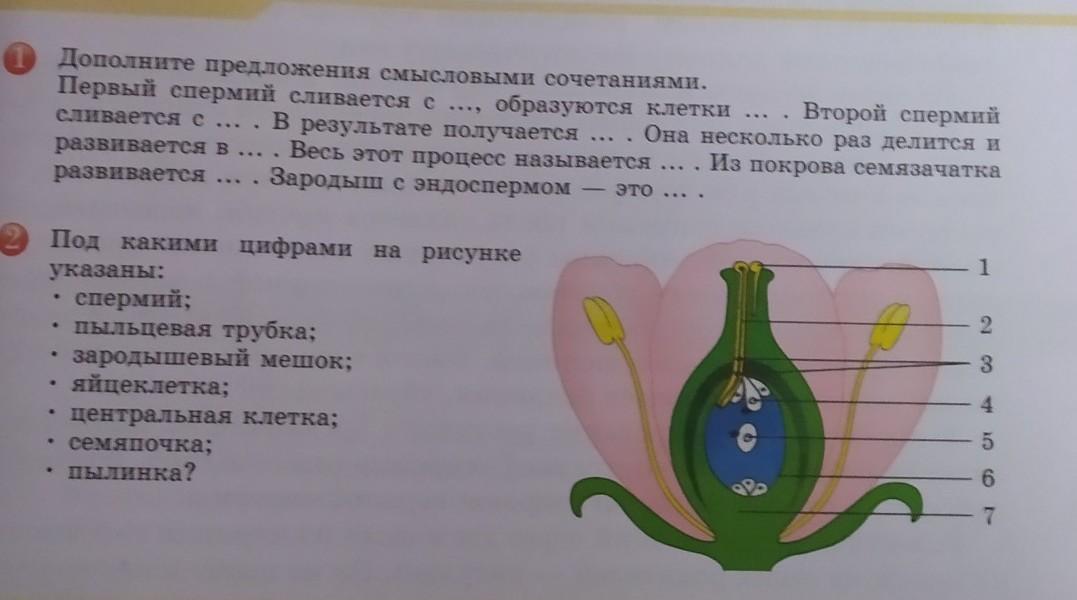 1. Первый спермий сливается с центральной клеткой, образуются клетки эндосперма. Второй спермий сливается с яйцеклеткой. В результате получается зигота. Она несколько раз делится и развивается в многоклеточный зародыш. Весь этот процесс называется двойное оплодотворение. Из покрова семязачатка развивается семенная кожура. Зародыш с эндоспермом - семя.
