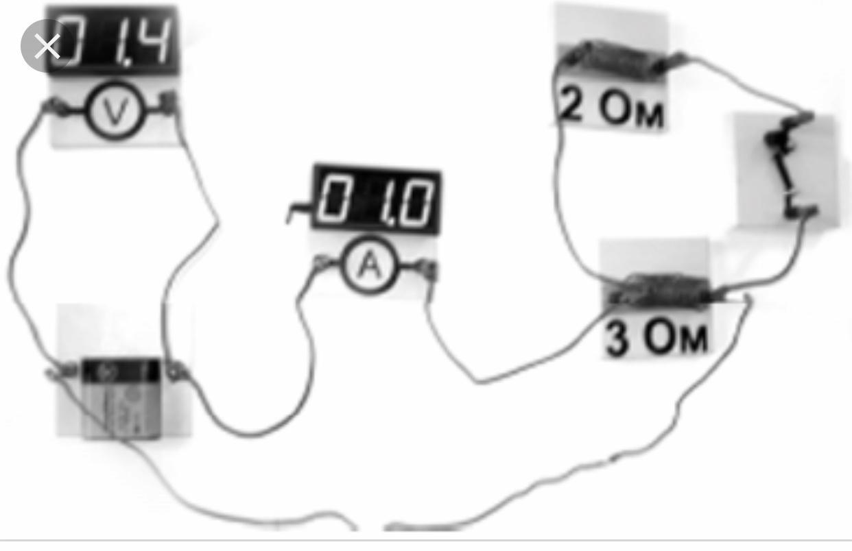 На рисунке приведена фотография электрической цепи. Начертите принципиальную схему этой цепи. Опираясь на законы постоянного тока, объясните, как должны изменяться (уменьшаться или увеличиваться) показания амперметра и вольтметра при размыкании ключа.