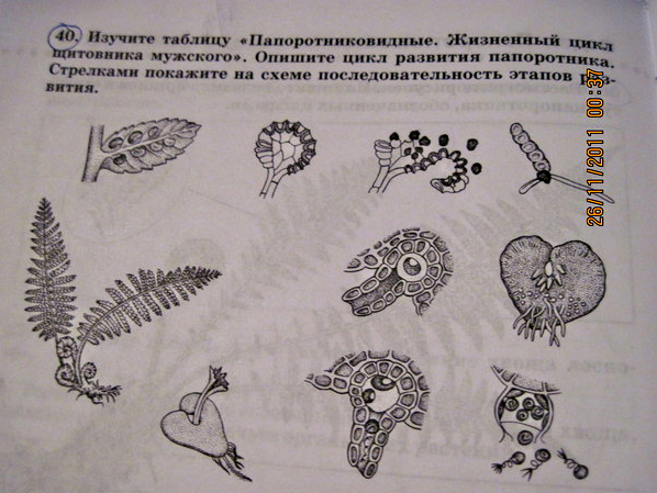Изучите таблицу "Папоротниковидные.Жизненный цикл щитовника мужского".Опишите цикл развития папоротника. Стрелками покажите на схеме последовательность этапов развития.