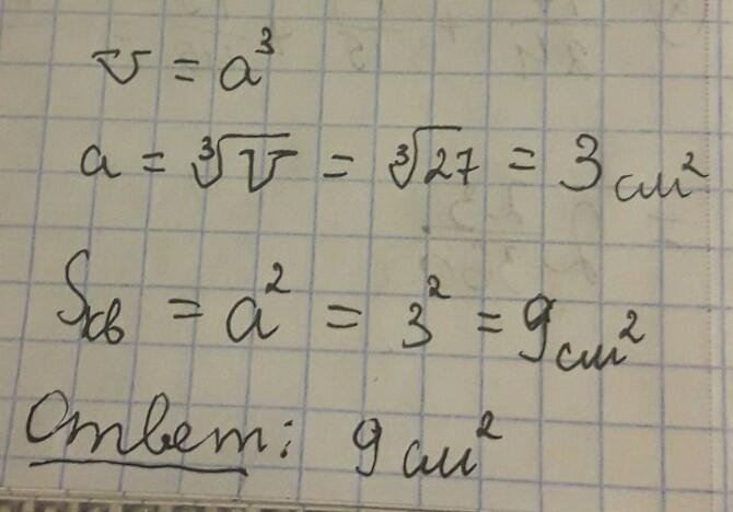 обьем куба равен 27см найдите площадь квадрата -грани куба . срочно нужно