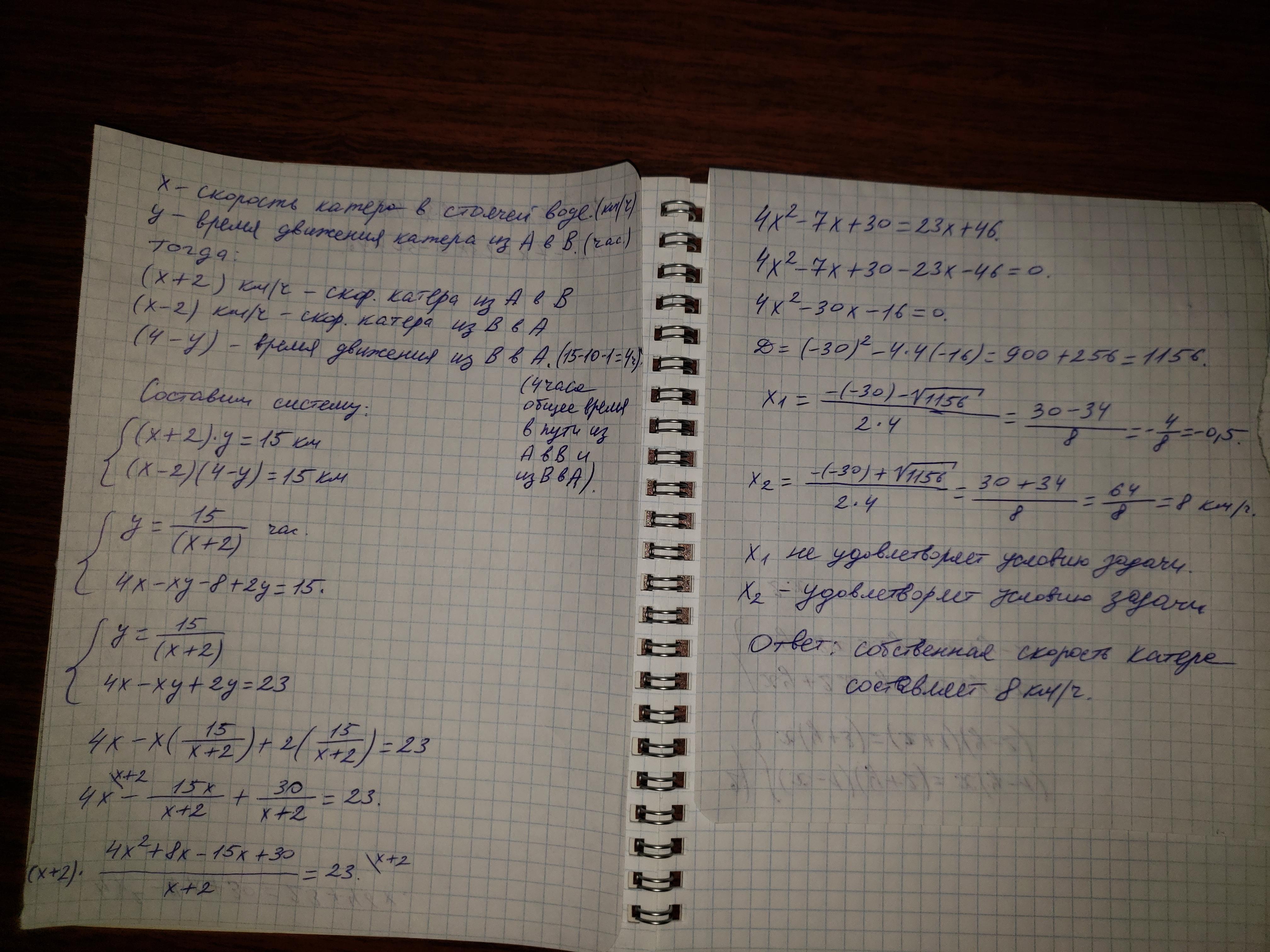 Катер в 10:00 вышел из пункта А в пункт В, расположенный в 15 км от А. Пробыв в пункте В 1 час, катер отправился назад и вернулся в пункт А в 15:00 того же дня. Определите (в км/час) собственную скорость катера, если известно, что скорость реки равна 2 км/ч.