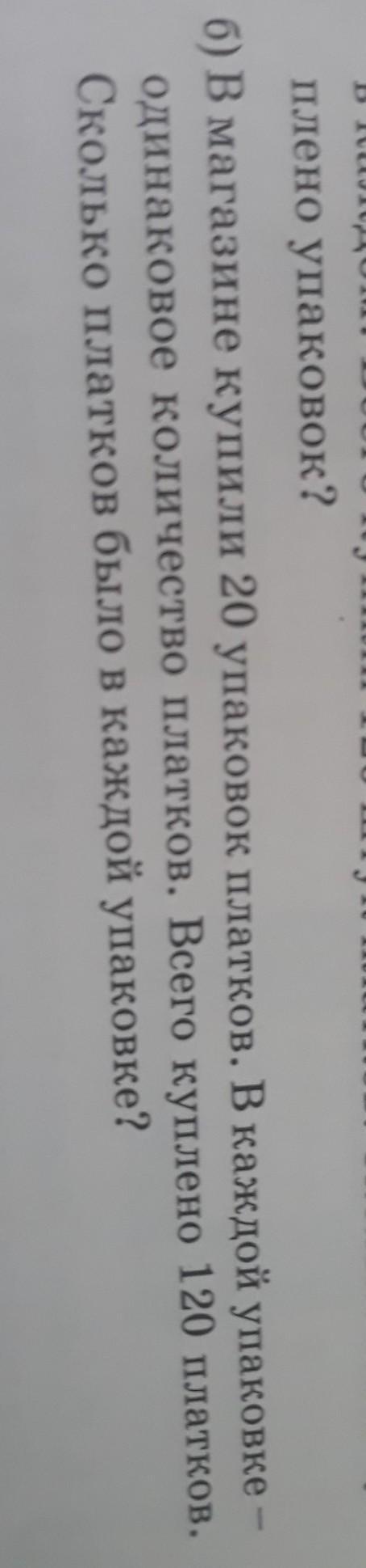 Всего платков 120. Такое кол-во распределено в 20 упаковках. Чтобы узнать кол-во платков в одной упаковке нужно разделить общее кол-во платков платков на кол-во упаковок.