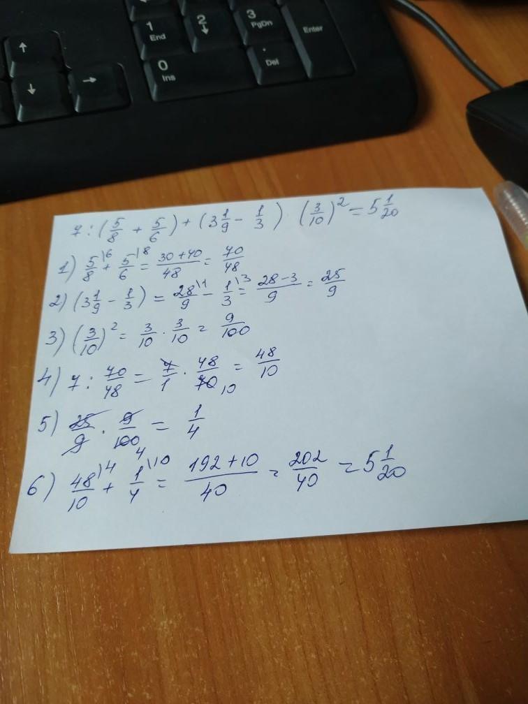 Найти значение выражения 7:(5/8+5/6)+(3 1/9-1/3)*(3/10)в квадрате
