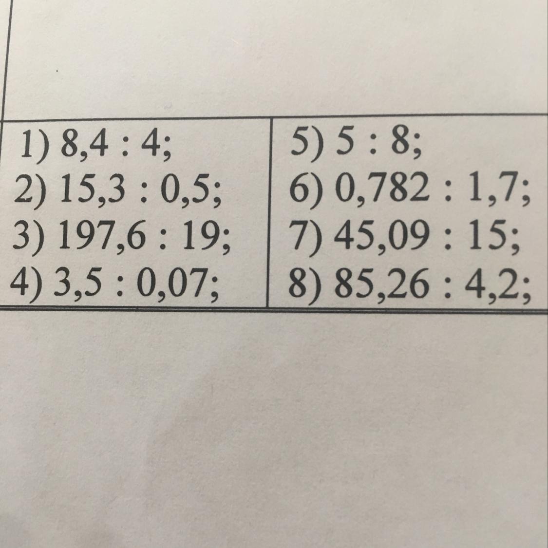 1) 8,4 : 4; 2) 15,3 : 0,5; 3) 197,6 : 19; 4) 3,5 : 0,07; 5) 5 : 8; 6) 0,782 : 1,7; 7) 45,09 : 15; 8) 85,26 : 4,2;