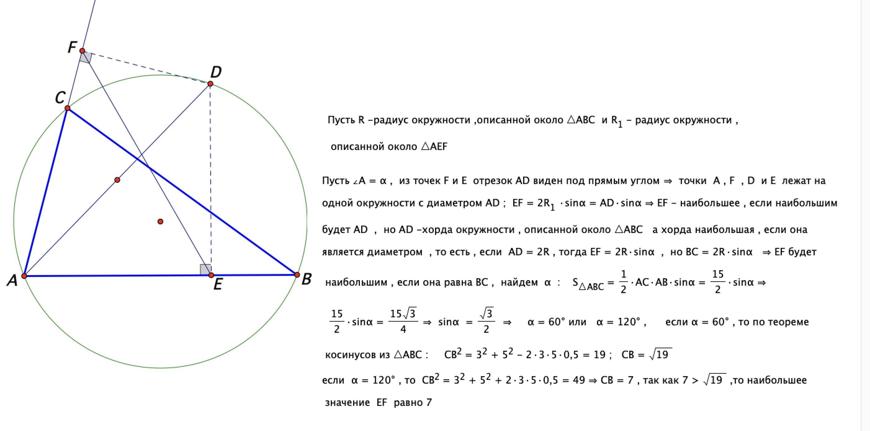 Из точки D описанной окружности треугольника ABC опущены перпендикуляры DE и DF на прямые AB и AC. Найдите наибольшее значение длины отрезка EF, если AB = 5, AC = 3, а площадь треугольника равна ( 15корней из 3)/4.