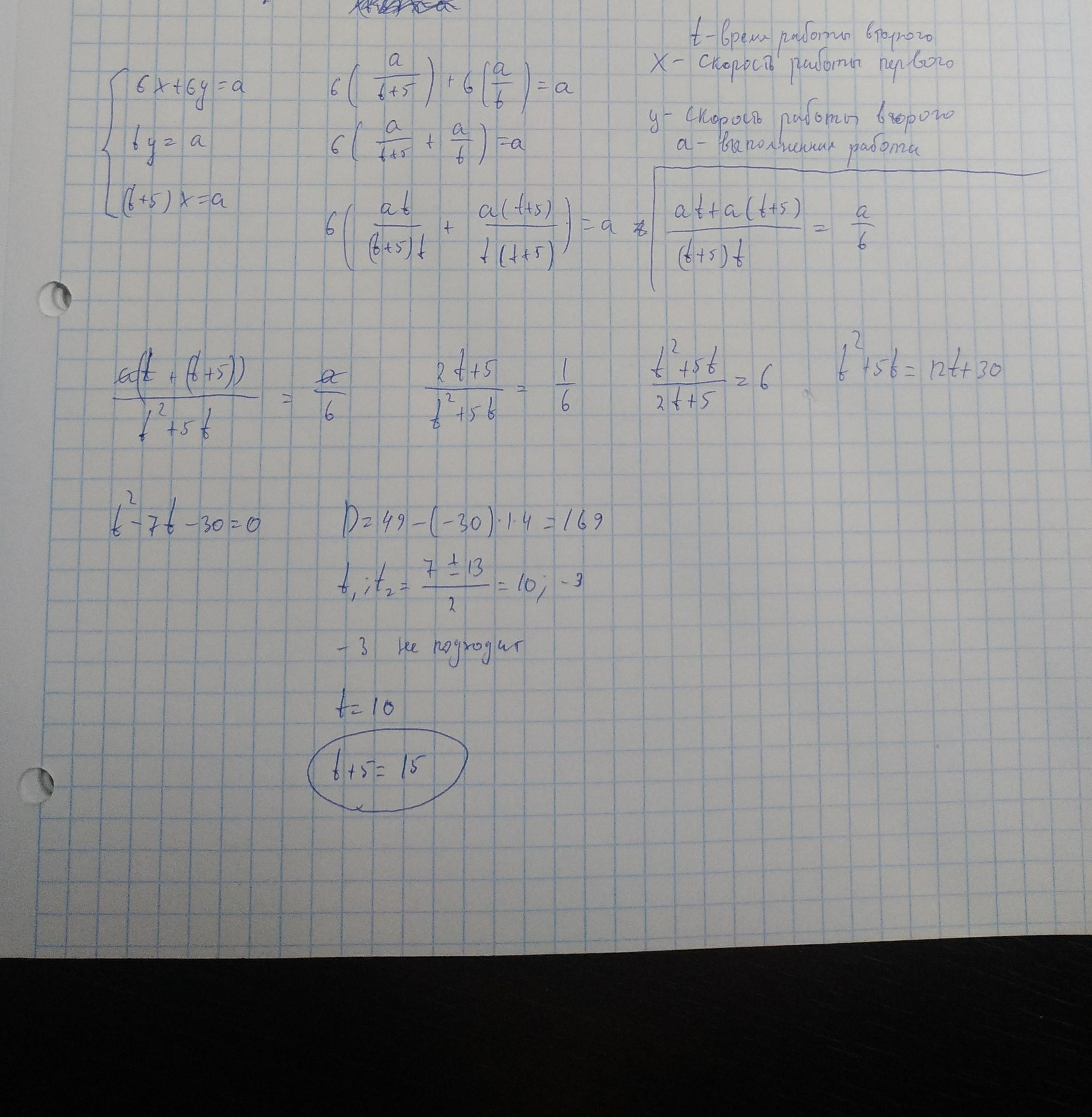 Два маляра,выполняя работу вместе,смогут закончить ее за 6 дней. Сколько дней потребуется для выполнения работы первому маляру,если известно,что второму требуется для этого на 5 дней меньше?