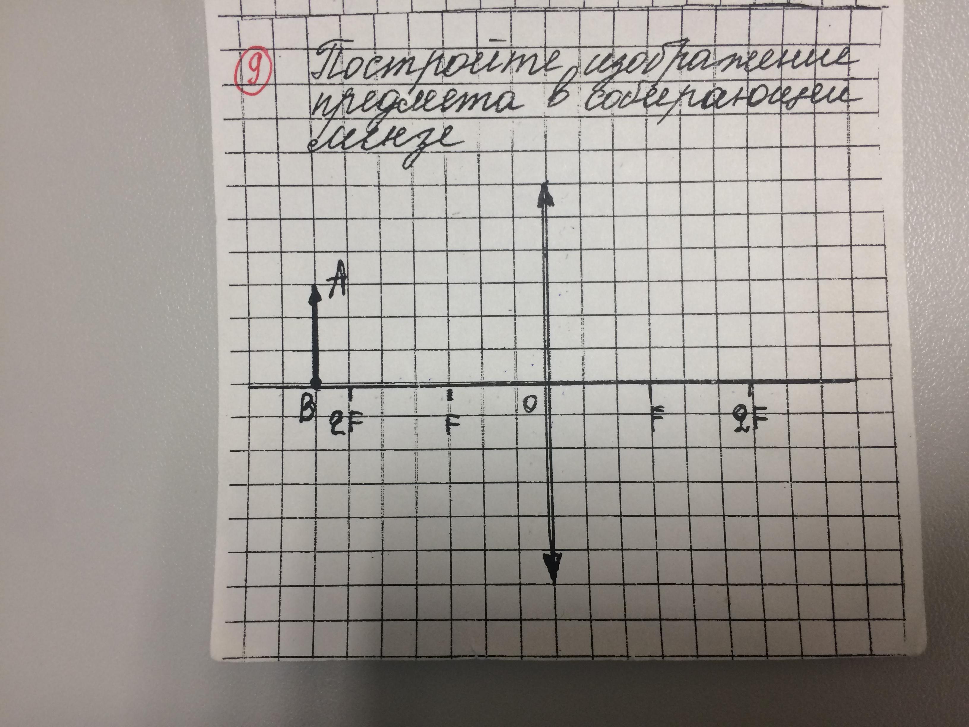 2) из А проведи линии: 1-до линзы и затем через F; 2- прямо через О. Там, где они пересекутся, будет точка А' изображения. Нарисуй отрезок перпендикуляра до оси, пририсуй стрелку -это и будет изображение , кверх тормашкой и уменьшенное