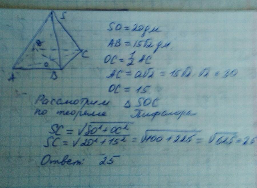 Дана правильная четырехугольная пирамида, стороны основания которой равны 15√2 дм, а высота 20 дм, найдите боковое ребро пирамиды