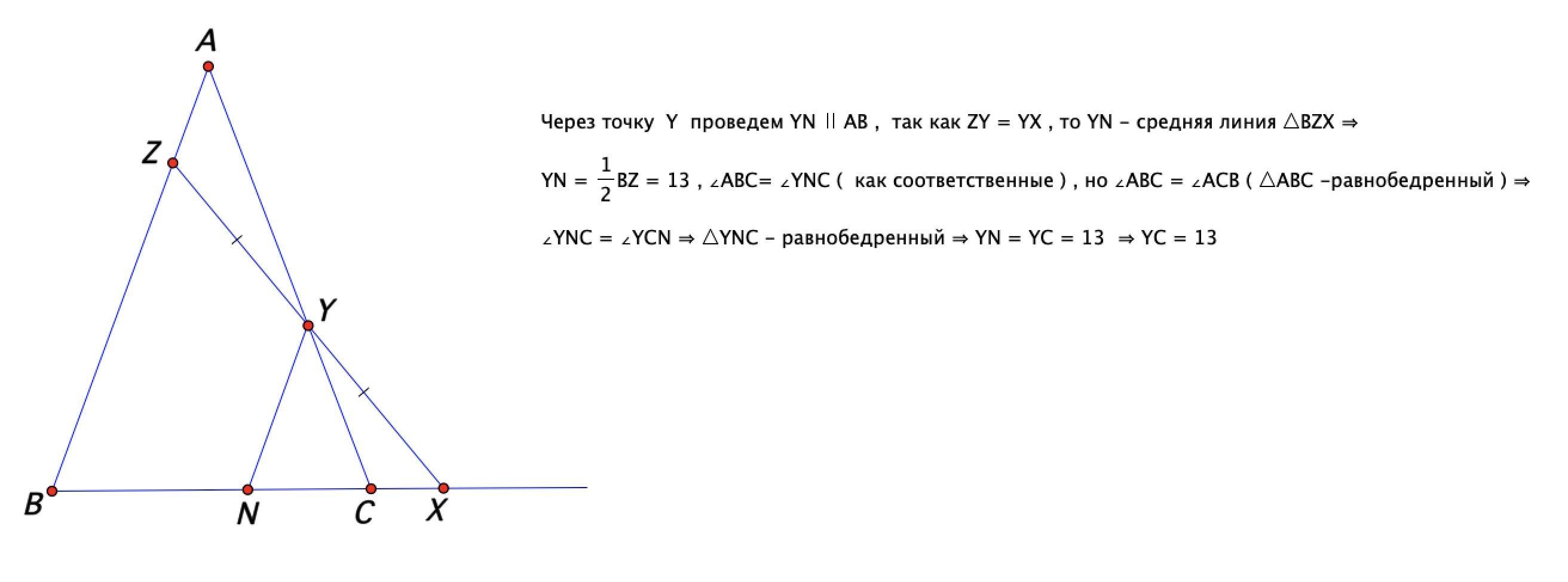 На продолжении основания BC равнобедренного треугольника ABC за точку C выбрана точка X. Через точку X проведена прямая, пересекающая отрезки AB и AC в точках Z и Y соответственно, причём XY=YZ. Найдите длину отрезка CY, если BZ=26.