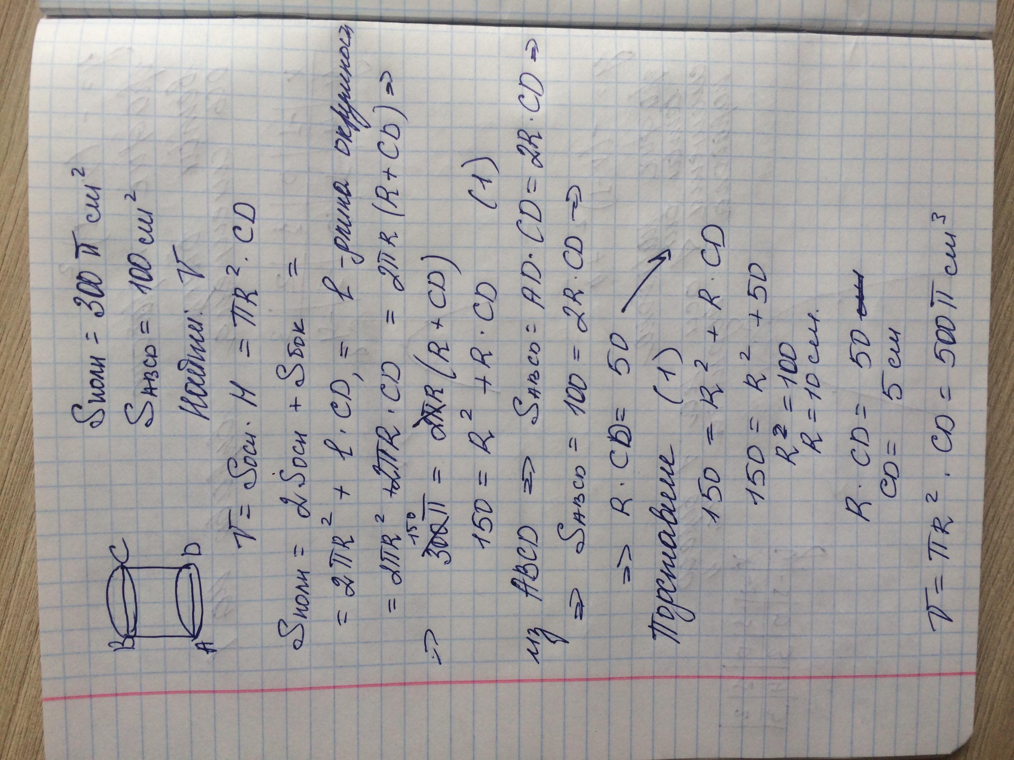Дан цилиндр. Площадь полной поверхности равна 300п см^2, площадь осевого сечения равна 100 см^2. Найти объем.