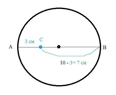 Радіус кола дорівнює 5см, найменша відстань від точки, що лежить усередині кола, до кола дорівнює 3см. Знайдіть найбільшу відстань від цієї точки до кола