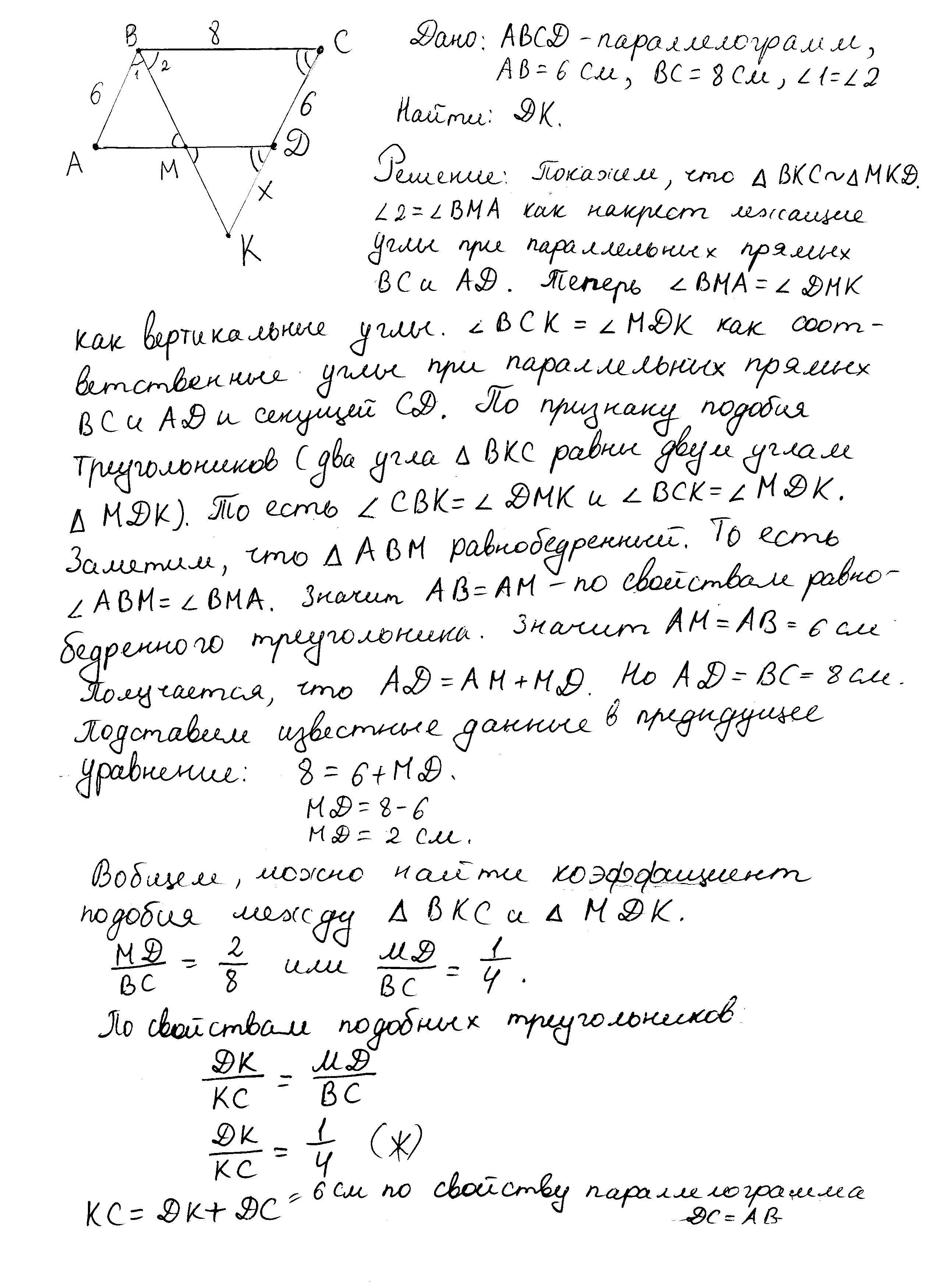 Угол ABC обозначаем за 2x. Тогда угол BAD = 180-2х, ADC = 2х, DCB = 180-2х. Теперь найдем угол CKМ. Так как KB - это секущая (для AB и CD), то углы 1 и CKM - равные. Поэтому угол CKM = x. Теперь найдем угол CDK. С одной стороны, он развернутый, а с другой стороны: CDK = CDM + CKB = 2x + x = 3x. Отсюда x = 60 и рассматриваемый треугольник - равносторонний. Все его стороны равны, СК - в том числе. Поэтому: DK = CK - DC = 8 - 6 = 2.