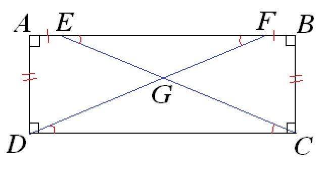 Т.к. АВСD - прямоугольник, то АВ║CD. Тогда ∠EFG=∠GDC(как накрестлежащие при секущей FD) и ∠FEG=∠GCD (как накрестлежащие при секущей ЕС). Отсюда, ΔDGС - равнобедренный с основанием DC, тогда DG=GC. Доказан пункт A).