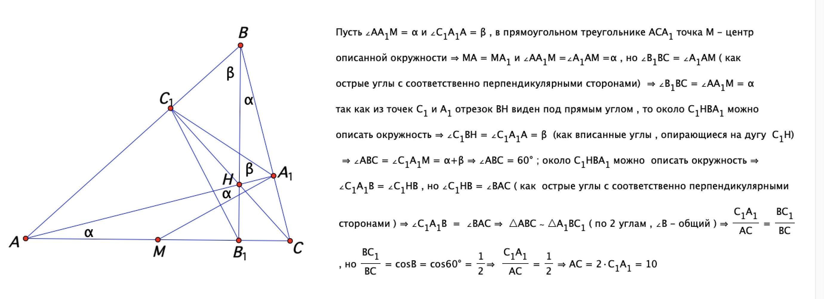 в остроугольном треугольнике АВС провели высоты АА1 и СС1. Точка М средина стороны АС. Известно что угол МА1С1=60 градусов, А1С1=5 см. Найдите сторону АС