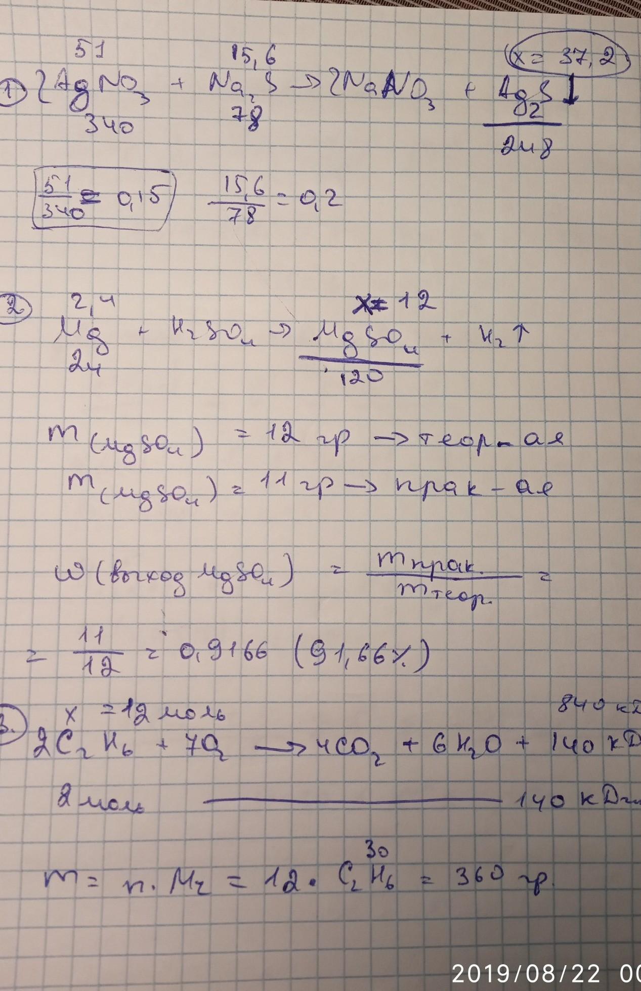 2)При взаимодействии 2,4 г магния с раствором серной кислоты получили 11 г соли. Определите выход продукта реакции(%).