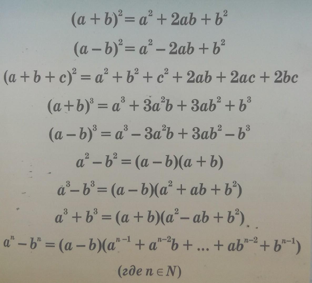 1)квадрат суммы двух слагаемых равен сумме квадрата первого слагаемого, удвоенного произведения первого на второе слагаемое и квадрата второго слагаемого