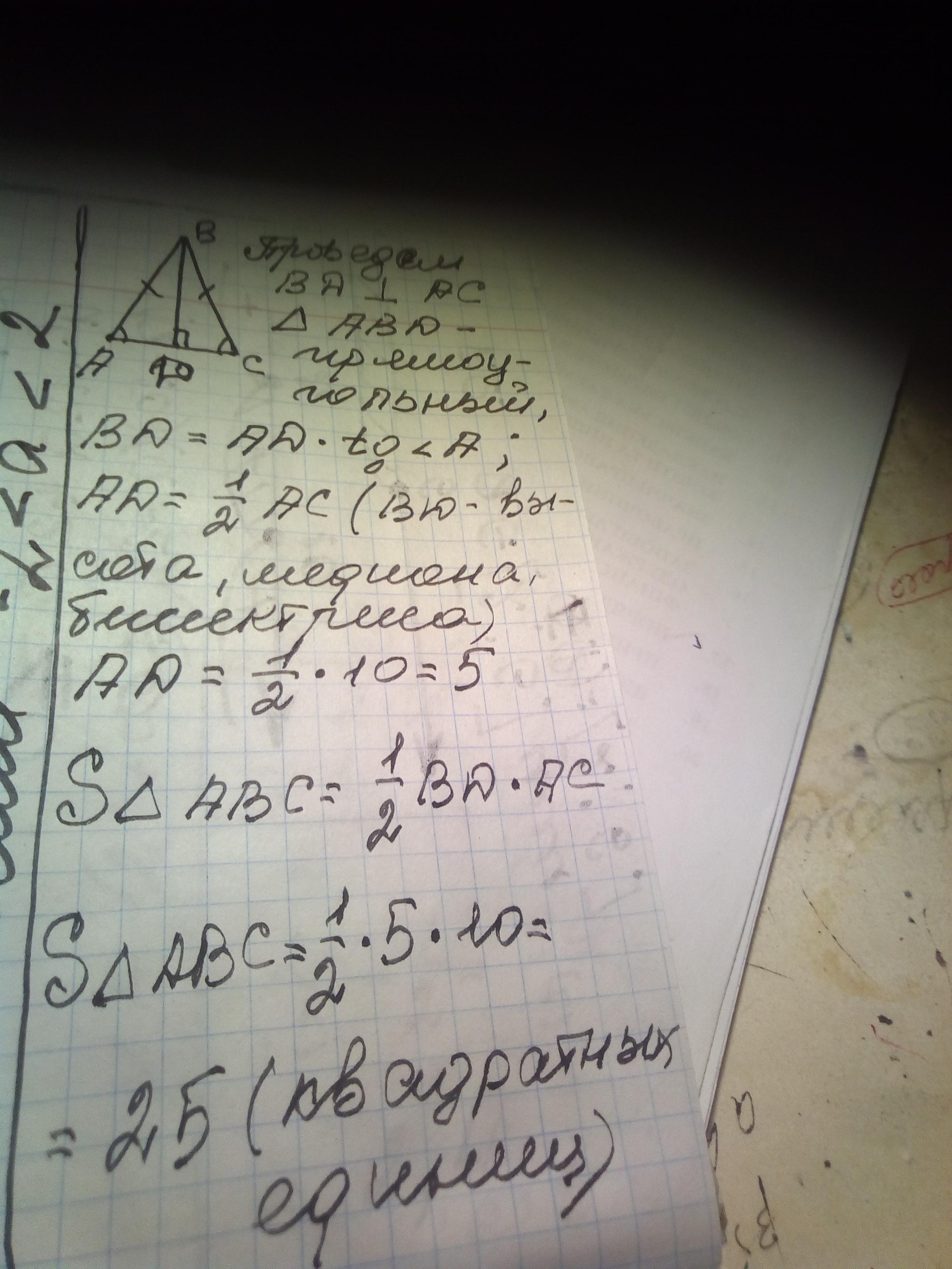 треугольник ABC равнобедренный(AB=BC, основание AC), угол A равен 30 градусам, AC=6, найти площадь треугольника ABC.