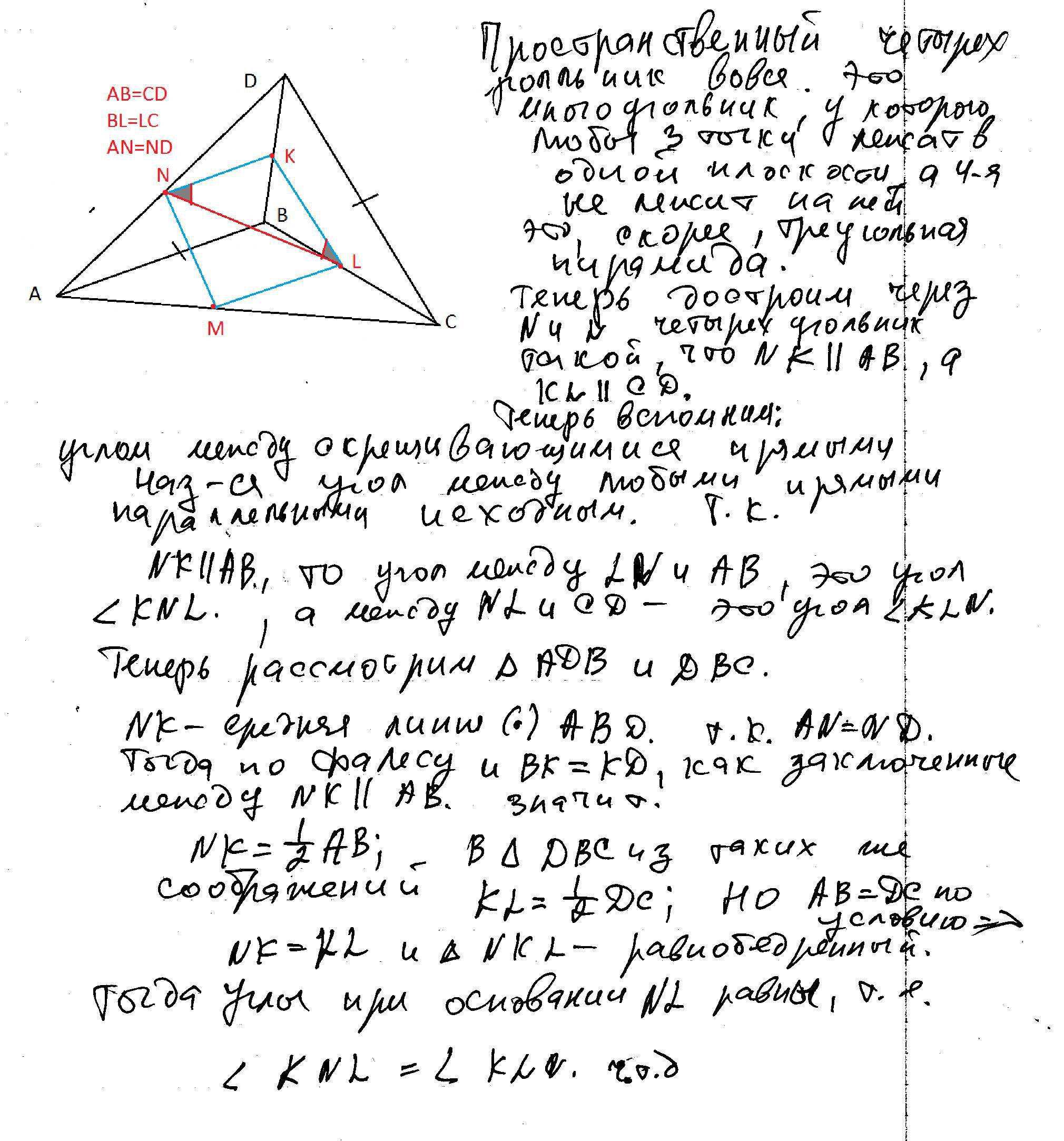 В пространственном четырехугольнике ABCD AD=CD докажите что прямые ab и cd образуют равные углы с прямой проходящей через середины отрезков BC и AD
