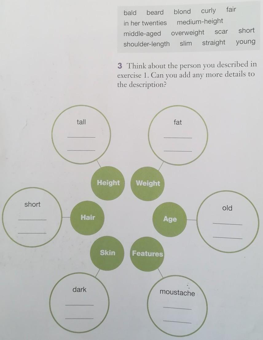 Hair: bald (лысый), blond (блонд), curly (кудрявый), shoulder-length (длина до плеч), straight (прямые).
