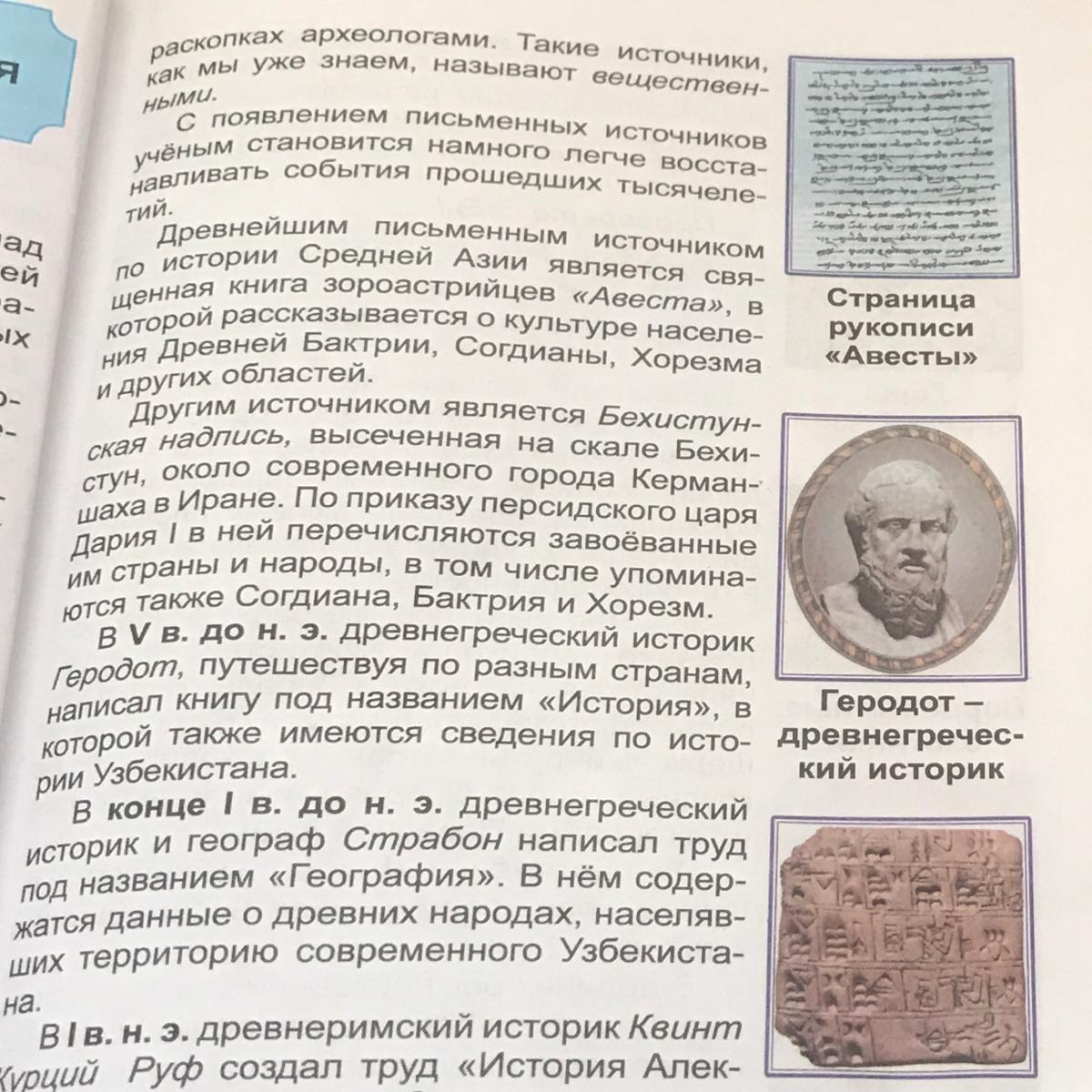 на первой изображена страница из рукописи Авесты на второй великий историк писатель Геродот он записал многие исторические события на третьей древние письменности первые письменности были записаны на камнях это одна из них