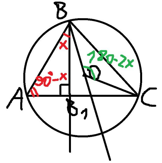 Пусть <ABB1 = x, тогда если <BB1A = 90 градусов (т.к. BB1 - высота), то ABB1 = (180 - 90 - x) градусов = (90 - x) градусов. Т.к. <BAC - вписанный для дуги BC, а <BOC - центральный для этой же дуги BC, то <BOC = 2*<BAC = 2*(90 - x)градусов = (180 - 2x) градусов. Очевидно, что BO = OC = R, тогда треугольник BOC - равнобедренный, тогда <CBO = <BCO = (180 - < BOC) / 2 = (180 - (180 - 2x)) / 2 = 2x / 2 = x. Следовательно <ABB1 = <CBO = x.