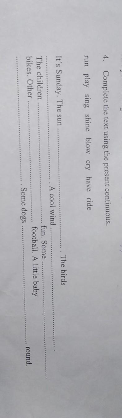 The sun is shining.The birds are singing.A cool wind is blowing. The children are having fun.Some are riding bikes .Other are playing football.A little baby is crying.Some dogs are running round.
