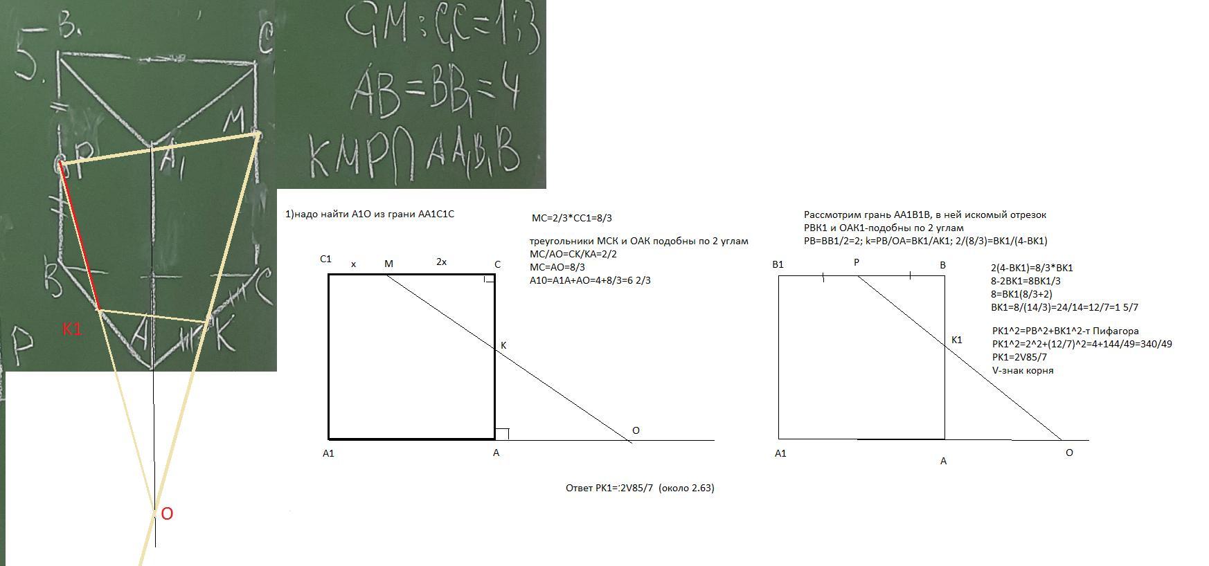 Помогите решить задачу на сечения в прямоугольной призме. Нужно найти длину отрезка, по которому секущая плоскость пересекается с АА1ВВ1. Сечение я уже построил. Помогите пожалуйста!!!
