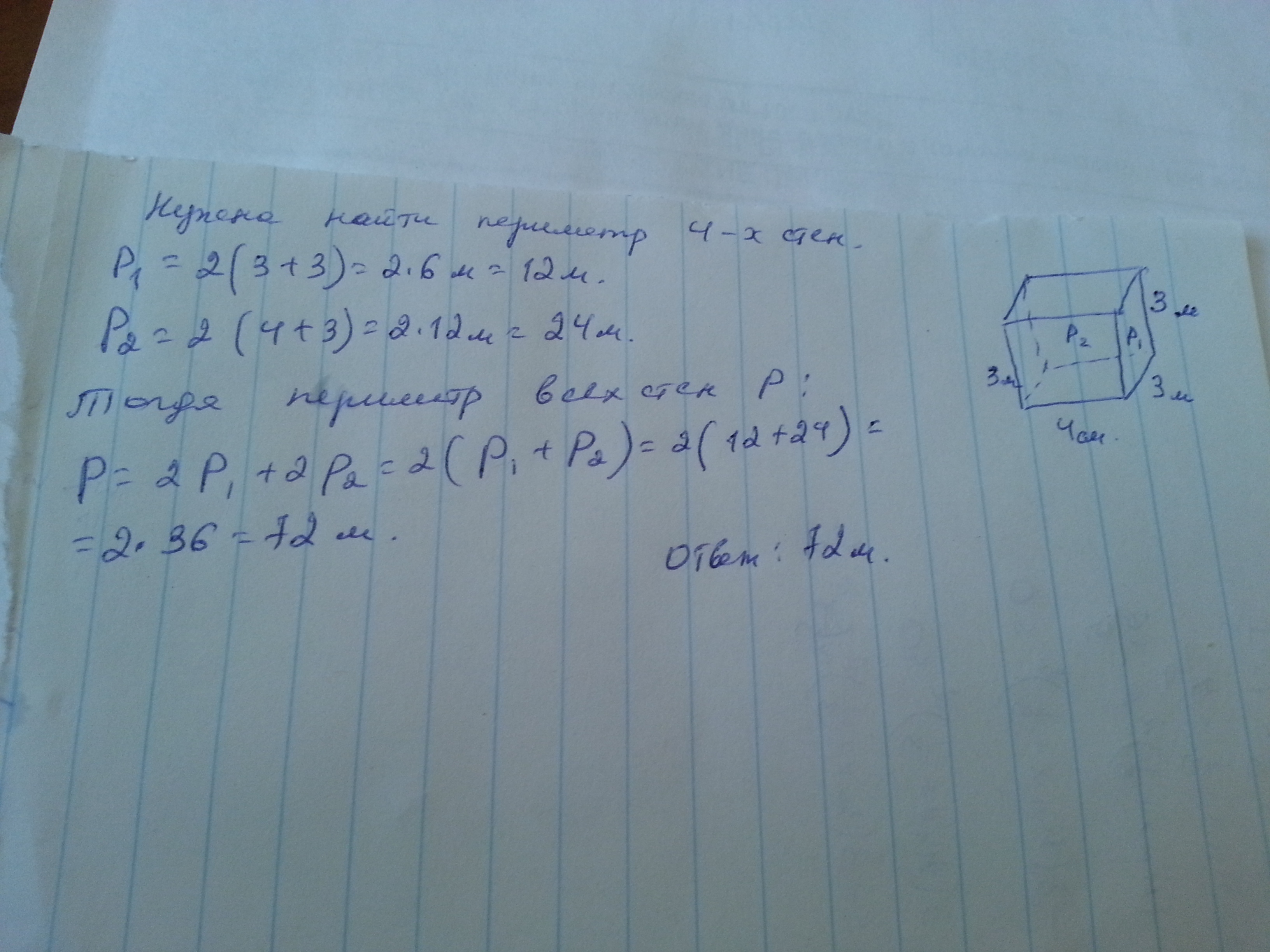Вычисли периметр стен,если длина комнаты 4 м ,ширина 3 м .Высота потолка 3м.