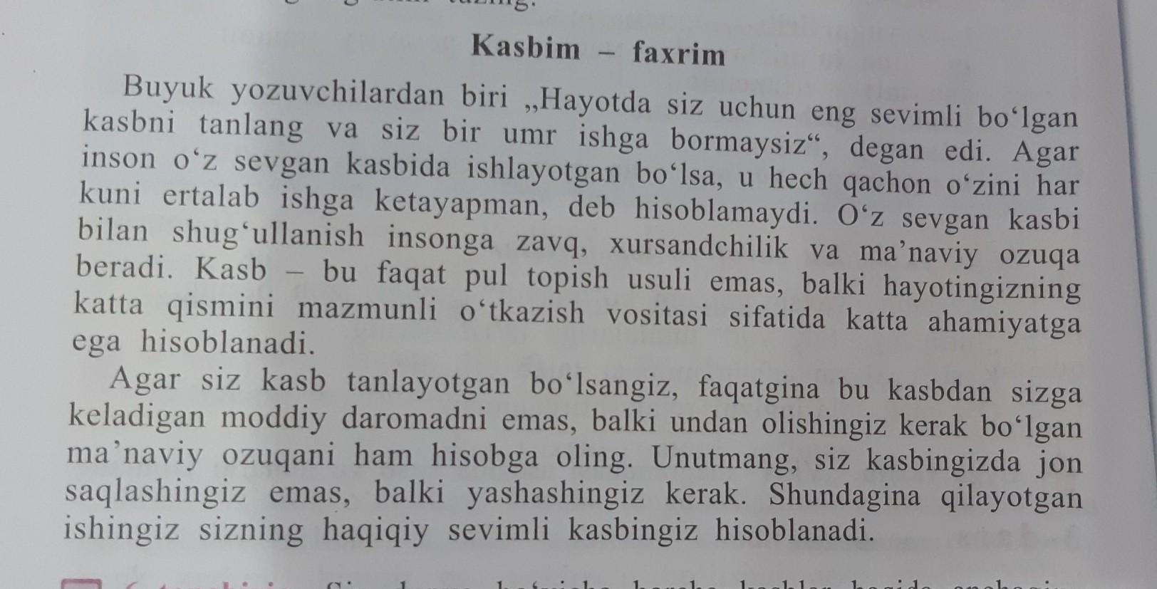 Один из великих писателей"В жизни выберите одну профессию и вы никогда не будете идти на работу",сказали.Если человек ходит на ту работу,которая ему нравится,то он никогда по утрам не будет думать,что он идёт на работу.Занятие любимым делом даёт человеку интерес,радость и manaviy ozuqa-прости не знаю.