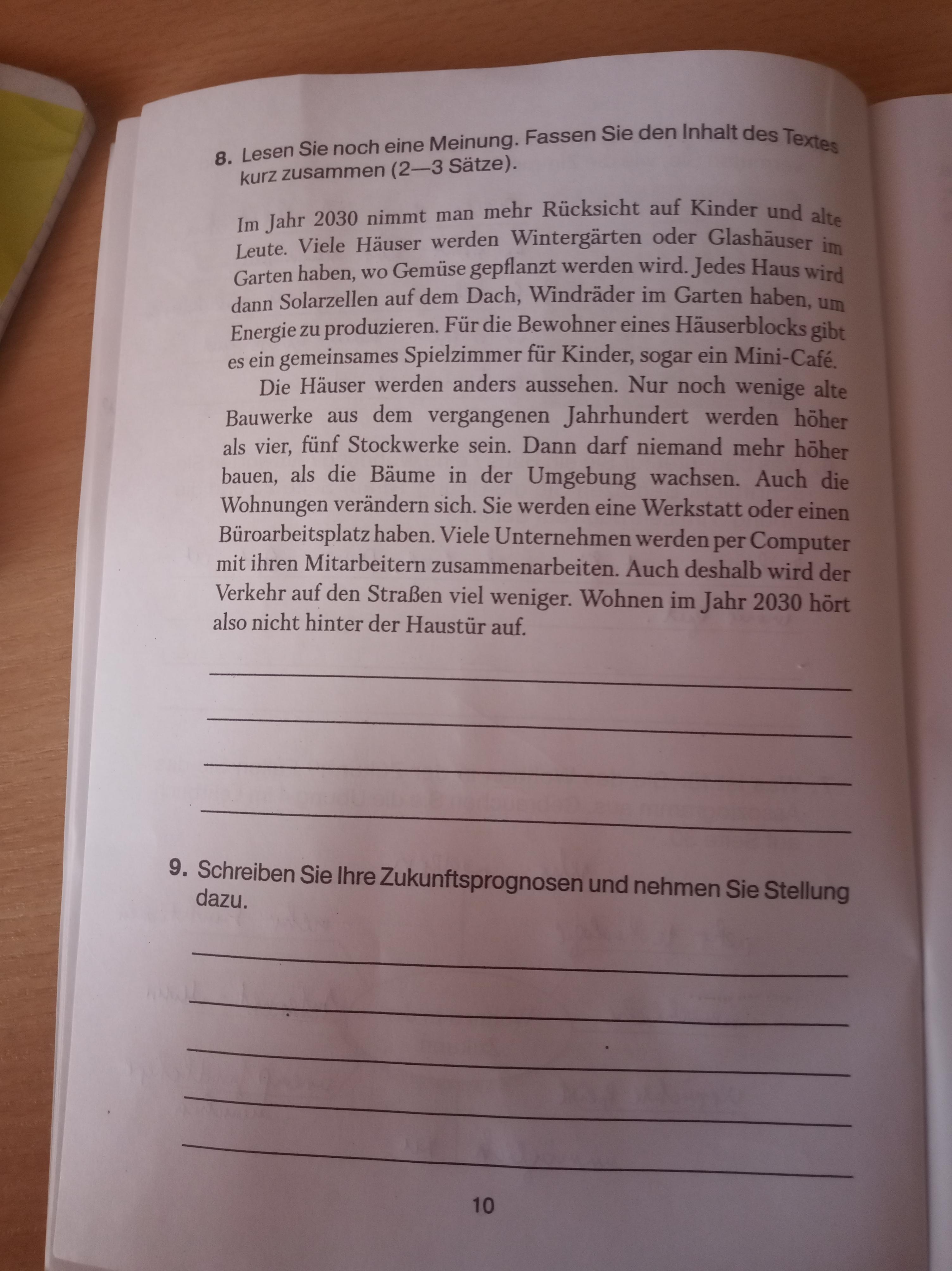 1. Im Text handelt es sich darum (речь идет о том), dass man in zehn Jahren viel mehr Rücksicht (уделять внимание) auf die Umwelt nehmen wird, wobei man Solarzellen auf dem Dach bauen und Windräder (ветряки) im Garten haben wird.